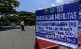 Polisi melakukan penjagaan saat pengendalian mobilitas ganjil genap untuk pengunjung TMII di Jalan Pintu 1 TMII, Jakarta, Sabtu (18/9). Ditlantas Polda Metro Jaya memberlakukan kebijakan pembatasan mobilitas warga dengan sistem ganjil genap pada dua kawasan TMII dan Taman Impian Jaya Ancol pada hari Jumat, Sabtu dan Ahad mulai pukul 12.00-18.00 WIB. Republika/Putra M. Akbar (FOTO : Republika/Putra M. Akbar)