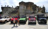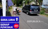 Mobil berplat ganjil lolos saat pemberlakuan aturan ganjil genap menuju kawasan wisata Tebing Breksi, Sleman, Yogyakarta, Ahad (19/9). (FOTO : Wihdan Hidayat / Republika)