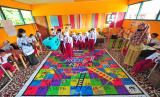 Dua guru mendampingi siswa kelas VI memainkan permainan ular tangga dengan tema konservasi di SDN 67, desa penyangga Taman Nasional Bukit Tigapuluh (TNBT), Muara Sekalo, Sumay, Tebo, Jambi, Senin (20/9/2021). Dinas Pendidikan dan Kebudayaan Kabupaten Tebo telah memasukkan muatan lokal pendidikan lingkungan hidup di semua sekolah tingkat SD hingga SMP sederajat di daerah itu sebagai upaya menumbuhkan generasi sadar lingkungan sejak dini. (FOTO : ANTARA/Wahdi Septiawan)