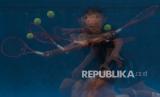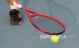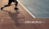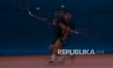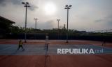 REPUBLIKA.CO.ID, PALEMBANG -- Atlet Tenis Lapangan Sumatera Selatan Dhimas Rizki Pratama berusaha mengambil bola aat berlatih tanding di Arena Tenis Jakabaring Sport City (JSC), Palembang, Sumatera Selatan, Senin (20/9/2021).