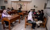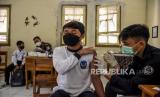 Sejumlah pelajar menjalani pemeriksaan kesehatan sebelum disuntik vaksin Covid-19 di SMPN 7 Bandung, Jalan Ambon, Kota Bandung, Selasa (21/9). Pemerintah Kota Bandung menyatakan program vaksinasi Covid-19 dosis pertama bagi pelajar di Kota Bandung telah mencapai 76 persen dan dosis kedua mencapai 50 persen. Foto: Republika/Abdan Syakura (FOTO : REPUBLIKA/ABDAN SYAKURA)