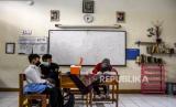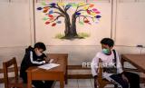 Sejumlah pelajar mengisi data diri saat pelaksanaan vaksinasi Covid-19 di SMPN 7 Bandung, Jalan Ambon, Kota Bandung, Selasa (21/9). Pemerintah Kota Bandung menyatakan program vaksinasi Covid-19 dosis pertama bagi pelajar di Kota Bandung telah mencapai 76 persen dan dosis kedua mencapai 50 persen. Foto: Republika/Abdan Syakura (FOTO : REPUBLIKA/ABDAN SYAKURA)