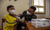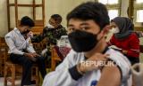Vaksinator menyuntikkan vaksin Covid-19 ke pelajar di SMPN 7 Bandung, Jalan Ambon, Kota Bandung, Selasa (21/9). Pemerintah Kota Bandung menyatakan program vaksinasi Covid-19 dosis pertama bagi pelajar di Kota Bandung telah mencapai 76 persen dan dosis kedua mencapai 50 persen. Foto: Republika/Abdan Syakura (FOTO : REPUBLIKA/ABDAN SYAKURA)