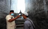 REPUBLIKA.CO.ID,BLITAR -- Petugas dinas pariwisata memeriksa suhu peziarah di gerbang masuk Kawasan Wisata Makam Presiden Soekarno di Kota Blitar, Jawa Timur, Selasa (21/9/2021).