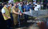 REPUBLIKA.CO.ID,BANDUNG -- Wali Kota Bandung Oded M Danial dan Wakil Wali Kota Bandung Yana Mulyana menyapu trotoar saat kegiatan Beresih Bandung Jilid 3 rangkaian menyambut Hari Jadi Kota Bandung (HJKB) ke-211, di Kawasan Alun-alun Kota Bandung, Selasa (21/9).