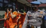 Anggota kepolisian menggiring tersangka saat rilis pengungkapan industri rumahan pengolahan narkoba di Polres Bogor, Kabupaten Bogor, Jawa Barat, Selasa (21/9/2021). Satuan Reserse Narkoba Polres Bogor bersama Ditresnarkoba Polda Jawa Barat berhasil mengamankan barang bukti sebanyak 23,45 kg bahan baku (biang) tembakau sintetis dan 2,7 kg tembakau sintetis siap edar serta berbagai alat pengolahan dari 11 tersangka. (FOTO : ANTARA/Yulius Satria Wijaya/wsj.)