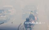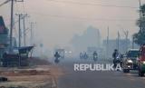 Sejumlah pengendara motor melintas di jalan yang diselimuti kabut asap kebakaran lahan di Kecamatan Liang Anggang, Banjarbaru, Kalimantan Selatan, Selasa (21/9/2021). Kencangnya angin di lokasi kebakaran lahan membuat api dengan cepat menyebar yang diperkirakan mencapai puluhan hektare, dan hingga kini BPBD Kota Banjarbaru dibantu relawan pemadam kebakaran Kota Banjarmasin masih berupaya memadamkan api yang mendekati permukiman penduduk di daerah setempat. (FOTO : Antara/Bayu Pratama S)