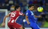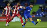 Jose Juan Macias dari Getafe (tengah) mengontrol bola selama pertandingan sepak bola La Liga Spanyol antara Getafe dan Atletico Madrid di stadion Coliseum Alfonso Perez di Getafe, Madrid, Spanyol, Rabu (22/9/2021) dini hari WIB. (FOTO : AP/Manu Fernandez)