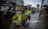 REPUBLIKA.CO.ID, DEPOK -- Pengendara motor melintasi banjir di kawasan Perempatan Mampang, Depok, Jawa Barat, Kamis (23/9). Banjir tersebut akibat sampah yang menumpuk di aliran Kali Licin yang terdapat di kolong jembatan jalan perempatan Mampang, Depok. Republika/Putra M. Akbar