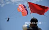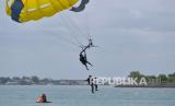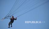 REPUBLIKA.CO.ID, BADUNG -- Penerbang pesawat tempur TNI AU terbang dengan parasut parasailing saat mengikuti latihan "Emergency Escape and Eject" di kawasan Tanjung Benoa, Badung, Bali, Kamis (23/9/2021).