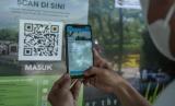 Pengunjung memindai barcode di kawasan Taman Wisata Candi (TWC) Ratu Boko, Prambanan, Sleman, DI Yogyakarta, Jumat (24/9/2021). Simulasi dilakukan setelah TWC Ratu Boko mendapatkan QR Code dari Kementerian Pariwisata dan Ekonomi Kreatif dan diizinkan beroperasi secara terbatas oleh Satuan Tugas Penanganan COVID-19 DIY di masa PPKM level 3. (FOTO : ANTARA/Hendra Nurdiyansyah)