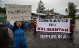 REPUBLIKA.CO.ID, PALANGKARAYA -- Sejumlah pelajar yang tergabung dalam komunitas Youth Kalimantan melakukan aksi menuntut keadilan iklim di tengah permukiman warga yang terendam banjir di Kalampangan Baru, Palangkaraya, Kalimantan Tengah, Jumat (24/9/2021).
