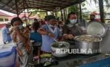 Warga korban banjir bergotong royong menyiapkan hidangan di posko darurat pengungsian SD Negeri 1 Langkai, Palangkaraya, Kalimantan Tengah, Jumat (24/9/2021). BPBD Kota Palangkaraya mencatat sebanyak 3.856 KK atau 9.907 jiwa terdampak banjir dan kurang lebih 35 jiwa terpaksa mengungsi akibat meluasnya luapan Sungai Kahayan dan Sungai Rungan yang belum surut dalam seminggu terakhir. (FOTO : Antara/Makna Zaezar)