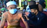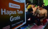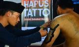 REPUBLIKA.CO.ID,KUDUS -- Relawan Baitul Maal Hidayatullah (BMH) menghapus tato peserta saat layanan hapus tato gratis di Kudus, Jawa Tengah, Sabtu (25/9/2021).