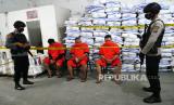 Tiga tersangka dihadirkan saat pengungkapan mega cland obat keras dan peredarannya di Kasihan, Bantul, Yogyakarta, Senin (27/9). Mabes Polri berhasil mengungkap pabrik obat keras ilegal dan jaringan peredaran DIY-Jabar-Jakarta-Jaktim-Kalsel di Yogyakarta. Sebanyak lebih dari 30 juta butir obat disita dari penggerebekan ini. Pabrik ini memiliki kapasitas produksi 2 juta per hari. Untuk sementara 13 tersangka diamankan aparat dari beberapa lokasi yang berbeda. Obat-obatan yang dibuat disini diantaranya Hexymer, Trihex, DMP, Double L, Irghapan. (FOTO : Wihdan Hidayat / Republika)