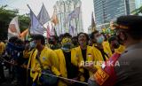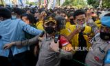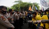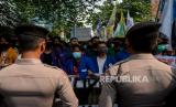 Petugas kepolisian menjaga barikade saat aksi mahasiswa yang tergabung dalam Aliansi BEM Seluruh Indonesia (BEM SI) dan Gerakan Selamatkan KPK (GASAK) di sekitar Gedung Merah Putih KPK, Jakarta, Senin (27/9). Dalam aksi tersebut BEM SI bersama GASAK menuntut pembatalan pemecatan 56 pegawai KPK yang tidak lulus Tes Wawasan Kebangsaan (TWK) pada 30 September mendatang. Republika/Thoudy Badai (FOTO : Republika/Thoudy Badai)