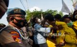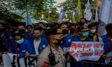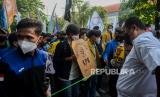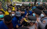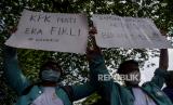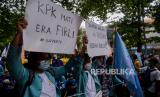 Mahasiswa yang tergabung dalam Aliansi BEM Seluruh Indonesia (BEM SI) dan Gerakan Selamatkan KPK (GASAK) menggelar aksi unjuk rasa di sekitar Gedung Merah Putih KPK, Jakarta, Senin (27/9). Dalam aksi tersebut BEM SI bersama GASAK menuntut pembatalan pemecatan 56 pegawai KPK yang tidak lulus Tes Wawasan Kebangsaan (TWK) pada 30 September mendatang. (FOTO : Republika/Thoudy Badai)