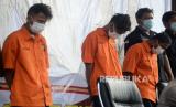 REPUBLIKA.CO.ID,JAKARTA -- Polisi berhasil menangkap tiga dari empat tersangka kasus penembakan seorang ustaz di Pinang, Kota Tangerang. Para tersangka dihadirkan saat rilis pengungkapan kasus pembunuhan di Polda Metro Jaya, Jakarta, Selasa (28/9).