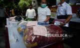 Tersangka dihadirkan saat rilis pengungkapan kasus pembunuhan di Polda Metro Jaya, Jakarta, Selasa (28/9). Dalam kesempatan tersebut kepolisian memastikan Armand alias Alex korban kasus pembunuhan bukanlah seorang ustadz melainkan paranormal yang membuka praktik pengobatan tradisional. Polisi berhasil menangkap tiga dari empat tersangka pembunuhan serta berhasil mengamankan barang bukti senjata api yang digunakan untuk menembak korban dan pakaian pelaku saat melancarkan aksinya. (FOTO : Prayogi/Republika.)