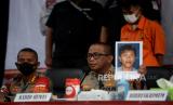 Kabid Humas Polda Metro Jaya Kombes Pol Yusri Yunus menunjukan foto DPO saat rilis pengungkapan kasus pembunuhan di Polda Metro Jaya, Jakarta, Selasa (28/9). Dalam kesempatan tersebut kepolisian memastikan Armand alias Alex korban kasus pembunuhan bukanlah seorang ustadz melainkan paranormal yang membuka praktik pengobatan tradisional. Polisi berhasil menangkap tiga dari empat tersangka pembunuhan serta berhasil mengamankan barang bukti senjata api yang digunakan untuk menembak korban dan pakaian pelaku saat melancarkan aksinya. Prayogi/Republika (FOTO : Prayogi/Republika.)