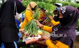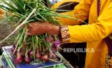 Warga memyortir bawang merah verietas Lokananta saat panen perdana di Turi, Sleman, Yogyakarta, Rabu (29/9). Panen perdana ini dari program inisiasi perbenihan bawang merah asal biji di Sleman. Selain itu, demi mendukung penyediaan benih bawang merah bermutu sepanjang tahun. Kelebihan dari benih bawang merah asal biji antara lain penanaman terbebas penyakit yang membawa benih, tidak ada masa dormansi bibit, dan lebih unggul baik produktivitas maupun fisiologis. (FOTO : Wihdan Hidayat / Republika)
