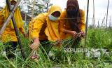Warga memanen bawang merah verietas Lokananta saat panen perdana di Turi, Sleman, Yogyakarta, Rabu (29/9). Panen perdana ini dari program inisiasi perbenihan bawang merah asal biji di Sleman. Selain itu, demi mendukung penyediaan benih bawang merah bermutu sepanjang tahun. Kelebihan dari benih bawang merah asal biji antara lain penanaman terbebas penyakit yang membawa benih, tidak ada masa dormansi bibit, dan lebih unggul baik produktivitas maupun fisiologis. (FOTO : Wihdan Hidayat / Republika)