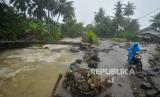 Warga melintasi jalan yang rusak usai diterjang banjir bandang di Kuliek, Nagari Sungai Buluah Timur, Kabupaten Padangpariaman, Sumatera Barat, Kamis (30/9/2021).  BPBD Padangpariaman mencatat, banjir bandang terjadi di daerah itu disebabkan hujan berintensitas tinggi sejak Rabu (29/9/2021), sementara di sejumlah titik di Padangpariaman terjadi banjir dan longsor.  (FOTO : ANTARA/Iggoy el Fitra)