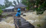 Warga melintasi jembatan kayu usai diterjang banjir bandang di Kuliek, Nagari Sungai Buluah Timur, Kabupaten Padangpariaman, Sumatera Barat, Kamis (30/9/2021). BPBD Padangpariaman mencatat, banjir bandang terjadi di daerah itu disebabkan hujan berintensitas tinggi sejak Rabu (29/9/2021), sementara di sejumlah titik di Padangpariaman terjadi banjir dan longsor.  (FOTO : ANTARA/Iggoy el Fitra)
