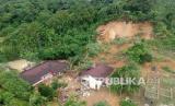 Foto udara kondisi rumah yang hancur akibat longsor di Korong Tanah Taban, Nagari Pasie Laweh, Lubuk Alung, Kabupaten Padangpariaman, Sumatera Barat, Kamis (30/9/2021). Data BPBD Padangpariaman, longsor yang terjadi pada Rabu (29/9/2021) malam itu mengakibatkan satu unit rumah rusak berat, satu bangunan gudang tertimbun longsor dan tujuh orang warga meninggal dunia, satu warga luka berat. (FOTO : Antara/Iggoy el Fitra)