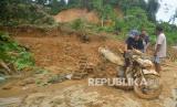 Warga memeriksa motornya yang rusak akibat longsor di Korong Tanah Taban, Nagari Pasie Laweh, Lubuk Alung, Kabupaten Padangpariaman, Sumatera Barat, Kamis (30/9/2021). Data BPBD Padangpariaman, longsor yang terjadi pada Rabu (29/9/2021) malam itu mengakibatkan satu unit rumah rusak berat, satu bangunan gudang tertimbun longsor dan tujuh orang warga meninggal dunia, satu warga luka berat. (FOTO : Antara/Iggoy el Fitra)