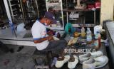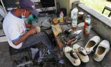 Gio mengerjakan pesanan sepatu kulit di sentra kerajinan kulit Manding, Bantul, Yogyakarta, Jumat (1/10). Sejak pandemi Covid-19, perajin sepatu kulit hanya mengandalkan pesanan atau reparasi. (FOTO : Wihdan Hidayat / Republika)