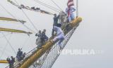 Anggota KRI Bima Suci melompat dari ujung haluan (cocor) saat tradisi terjun ke laut bagi personel KRI Bima Suci yang naik pangkat di Dermaga Faslabuh Selat Lampa Pangkalan TNI AL Ranai, Natuna, Kepulauan Riau, Jumat (1/10/2021). Tradisi tersebut berlaku bagi seluruh prajurit TNI AL yang bertugas di kapal dan menerima kenaikan pangkat setingkat lebih tinggi. (FOTO : Antara/Muhammad Adimaja)