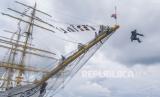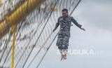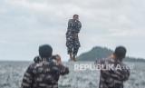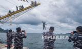 REPUBLIKA.CO.ID, NATUNA -- Perwira KRI Bima Suci melompat dari ujung haluan (cocor) saat tradisi "terjun ke laut" bagi personel KRI Bima Suci yang naik pangkat di Dermaga Faslabuh Selat Lampa Pangkalan TNI AL Ranai, Natuna, Kepulauan Riau, Jumat (1/10/2021). Tradisi tersebut berlaku bagi seluruh prajurit TNI AL yang bertugas di kapal dan menerima kenaikan pangkat setingkat lebih tinggi.