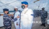 Komandan KRI Bima Suci Letkol laut (P) Waluyo memasangkan tanda pangkat kepada Anggota KRI Bima Suci saat upacara kenaikan pangkat dan tradisi terjun ke laut di Dermaga Faslabuh Selat Lampa Pangkalan TNI AL Ranai, Natuna, Kepulauan Riau, Jumat (1/10/2021). (FOTO : Antara/Muhammad Adimaja)