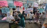 Sejumlah peternak ayam layer membagikan telur secara gratis kepada warga di Terminal Sambi, Kediri, Jawa Timur, Jumat (1/10/2021). Aksi membagikan sebanyak 500 bungkus telur tersebut sebagai bentuk protes peternak terhadap rendahnya harga jual telur ayam yang tidak sebanding dengan tingginya biaya produksi. (FOTO : Antara/Prasetia Fauzani)