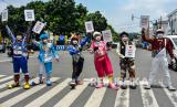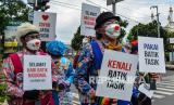 Sejumlah anggota Komunitas Badut Tasik (Battik) menunjukkan poster berisi dukungan pada budaya batik di Kota Tasikmalaya, Jawa Barat, Jumat (1/10/2021). Aksi Komunitas Battik itu dilakukan menjelang Hari Batik Nasional pada 2 Oktober, untuk mendorong kebangkitan pelaku usaha ekonomi kreatif khususnya perajin batik serta mengkampanyekan kecintaan terhadap batik yang diakui UNESCO sebagai warisan budaya. (FOTO : Antara/Adeng Bustami)