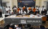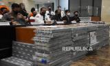 Polisi menujukkan tumpukan uang total kerugian yang mencapai Rp82 milyar..