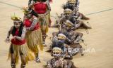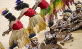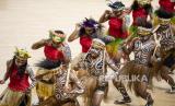 REPUBLIKA.CO.ID, JAYAPURA -- Sejumlah penari membawakan tarian Pangkur Sagu di Istora Papua Bangkit, Kampung Harapan, Kabupaten Jayapura, Papua, Jumat (1/10/2021). Tari Pangkur Sagu merupakan tarian adat Papua yang menceritakan tentang mata pencaharian masyarakat Papua dengan membuat sagu mulai dari menebang pohon hingga memeras air sagu, hingga sagunya siap diolah.