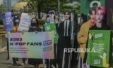 REPUBLIKA.CO.ID, JAKARTA -- Fans K-Pop yang tergabung dalam kpop4planet melaksanakan aksi damai di depan Tokopedia Tower, Jakarta, Jumat (1/10). Pada aksi tersebut fans K-Pop menominasikan Tokopedia untuk berkomitmen segera menggunakan 100 persen energi terbarukan pada tahun 2030.