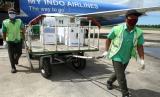 Petugas menarik kereta bermuatan sejumlah kotak berisi vaksin Pfizer sesaat setelah tiba di Bandara Supadio di Kabupaten Kubu Raya, Kalimantan Barat, Sabtu (2/10/2021). Sebanyak 453.960 vaksin Pfizer dikirim ke Pontianak (Kalimantan Barat), Berau (Kalimantan Utara), Samarinda (Kalimantan Timur), Palangka Raya (Kalimantan Tengah), Padang (Sumatera Barat), Palembang (Sumatra Selatan) dan Pangkalpinang (Bangka Belitung) untuk didistribusikan guna mendukung program pemerintah dalam percepatan vaksinasi COVID-19.  (FOTO : ANTARA/Jessica Helena Wuysang)