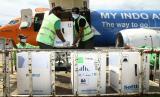 Petugas mengangkat kotak berisi vaksin Pfizer sesaat setelah tiba di Bandara Supadio di Kabupaten Kubu Raya, Kalimantan Barat, Sabtu (2/10/2021). Sebanyak 453.960 vaksin Pfizer dikirim ke Pontianak (Kalimantan Barat), Berau (Kalimantan Utara), Samarinda (Kalimantan Timur), Palangka Raya (Kalimantan Tengah), Padang (Sumatera Barat), Palembang (Sumatra Selatan) dan Pangkalpinang (Bangka Belitung) untuk didistribusikan guna mendukung program pemerintah dalam percepatan vaksinasi COVID-19.  (FOTO : ANTARA/Jessica Helena Wuysang)