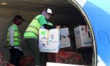 Sejumlah petugas menurunkan kotak berisi vaksin Pfizer dari pesawat sesaat setelah tiba di Bandara Supadio di Kabupaten Kubu Raya, Kalimantan Barat, Sabtu (2/10/2021). Sebanyak 453.960 vaksin Pfizer dikirim ke Pontianak (Kalimantan Barat), Berau (Kalimantan Utara), Samarinda (Kalimantan Timur), Palangka Raya (Kalimantan Tengah), Padang (Sumatera Barat), Palembang (Sumatra Selatan) dan Pangkalpinang (Bangka Belitung) untuk didistribusikan guna mendukung program pemerintah dalam percepatan vaksinasi COVID-19 (FOTO : ANTARA/Jessica Helena Wuysang)
