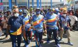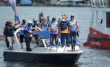 Pesepak bola legendarIs Indonesia Rully Rudolf Nere (kanan) dan Bupati Jayapura Mathius Awoitouw (kiri) membawa obor api PON Papua setibanya di Dermaga Kalkhote, Danau Sentani, Kabupaten Jayapura, Papua, Sabtu (2/10/2021). Api PON Papua tiba di Kabupaten Jayapura untuk nantinya dibawa ke Stadion Lukas Enembe untuk upacara penyalaan Kaldron pada pembukaan PON Papua. (FOTO : ANTARA/FAUZAN)