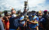 Mantan pebola voli nasional Kartika Monim (kanan), mantan atlet dayung nasional Erni Sokoi (ketiga kanan) dan Bupati Jayapura Mathius Awoitouw (kedua kanan) membawa obor api PON Papua setibanya di Dermaga Kalkhote, Danau Sentani, Kabupaten Jayapura, Papua, Sabtu (2/10/2021). Api PON Papua tiba di Kabupaten Jayapura untuk nantinya dibawa ke Stadion Lukas Enembe untuk upacara penyalaan Kaldron pada pembukaan PON Papua. (FOTO : ANTARA/FAUZAN)