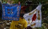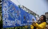 Perajin saat menjemur kain batik buatan peserta di Kampung Batik Cibuluh, Kota Bogor, Jawa Barat, Sabtu (2/10). Kampung Batik Cibuluh menggelar kegiatan belajar membatik dalam rangka memperingati Hari Batik Nasional sekaligus untuk mengenalkan dan melestarikan salah satu warisan budaya dunia tersebut. Republika/Putra M. Akbar (FOTO : Republika/Putra M. Akbar)