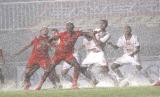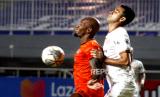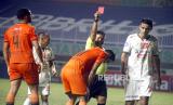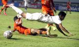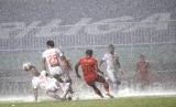 REPUBLIKA.CO.ID, BOGOR -- Pesepak bola Persija Jakarta Yann Motta (kiri) mencoba menguasai bola dibayangi pesepak bola Persiraja Banda Aceh Defri Riski (kedua kanan) dalam lanjutan laga Liga 1 di Stadion Pakansari, Kabupaten Bogor, Jawa Barat, Sabtu (2/10/2021). Pertandingan tersebut dijeda selama 30 menit akibat hujan deras.