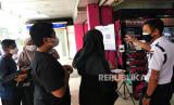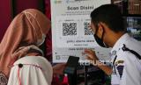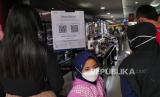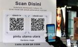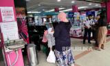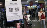 REPUBLIKA.CO.ID,YOGYAKARTA -- Pengunjung antre memindai barcode aplikasi peduli lindungi di Supermarket Gardena, Yogyakarta, Ahad (3/10).