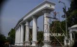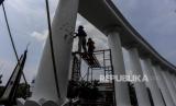 REPUBLIKA.CO.ID,BOGOR -- Pekerja mengecat tiang Monumen Lawang Salapan di Kota Bogor, Jawa Barat, Senin (4/10).