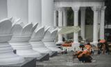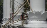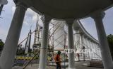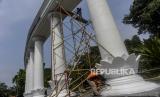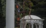 Pekerja mengecat tiang Monumen Lawang Salapan di Kota Bogor, Jawa Barat, Senin (4/10). Perawatan Monumen Lawang Salapan yang meliputi pengecatan ulang dan mengganti lantai yang sudah rusak dilakukan untuk menjaga salah satu ikon Kota Bogor tersebut agar tidak terlihat kumuh.   (FOTO : Republika/Putra M. Akbar)