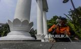 Pekerja saat akan mengecat tiang Monumen Lawang Salapan di Kota Bogor, Jawa Barat, Senin (4/10). Perawatan Monumen Lawang Salapan yang meliputi pengecatan ulang dan mengganti lantai yang sudah rusak dilakukan untuk menjaga salah satu ikon Kota Bogor tersebut agar tidak terlihat kumuh. Republika/Putra M. Akbar (FOTO : Republika/Putra M. Akbar)
